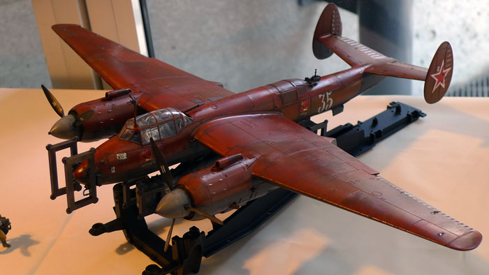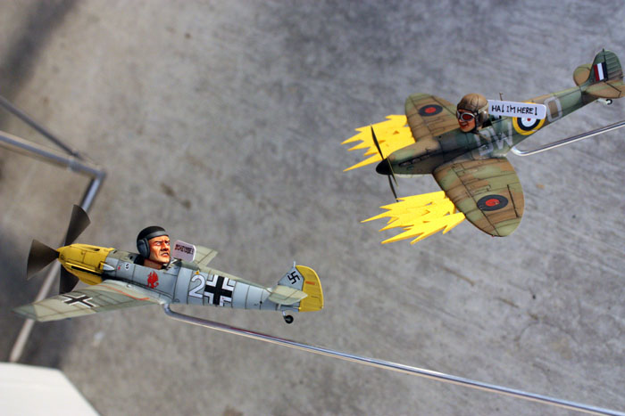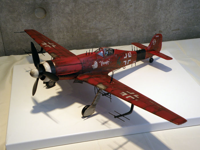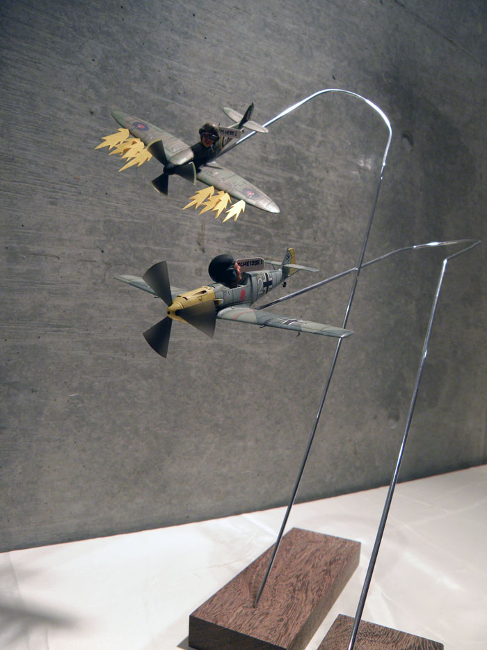 「第3013爆撃機小隊」_既にベルリン陥落が間近となった1945年4月29日、黒海に面する港湾地区-ウクライナ・オデッサ付近に、そのソビエトの極めて小さな部隊はあった。 どの公式書類にも存在しないこの部隊が装備する"唯一の"試作爆撃機「Tu-2БТ」は今、≪Бесник Тувайц≫という名の異形のロケットを抱いて、帝都ベルリンへ向け離陸の準備に入った。 タミヤの凄さを認識するためにストレート・フロム・ボックスで。 ディティールアップなし。フィギュアはウルトラキャスト製です。 仕上がりはともかくw、作ってみるとタミヤって凄いなと思えるキットでした。 そういえば1/32の飛行機作ったのって20年振り位だなぁw 連合国パイロットから"赤いヘルマン”と恐れられた夜戦エースパイ ロット、ヘルマン・フューゲル少佐の大戦中最後の搭乗機である。 新型レーダーや兵装を搭載した試作/改造機で編成された第8特殊試験飛行隊は大戦末期に第99夜間戦闘航空団”ヴァンピーア”(吸血鬼)として再編成され、連合国の夜間重爆撃機群を迎撃した。 人生2つ目の飛行機作品。第二次大戦中の英独空軍の戦い、いわゆる バトル・オヴ・ブリテンの一場面…のつもりです。 たまたま1/72の飛行機と1/20のフィギュアを一緒に作っていて、フィギュ アの首を飛行機に差してみたらちょっと面白かった、というのがきっかけで 製作。 いやあ、しかし作り始めた時は自分でもこうなるとは…何でしょう、これは。 更にVol.4へ続きます。 |